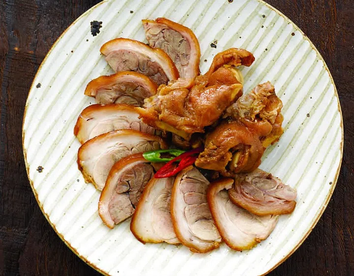 Pig’s feet glazed in a soy sauce with ginger and garlic. Served off the bone and thinly sliced. The high gelatin content of jokbal helps to maintain healthy and youthful complexion.