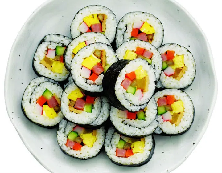 Rice seasoned with salt and sesame oil and rolled up in a sheet of roasted gim (dried laver) with spinach, carrots, and pickled white radish. The long roll is sliced and served in bite-size pieces.