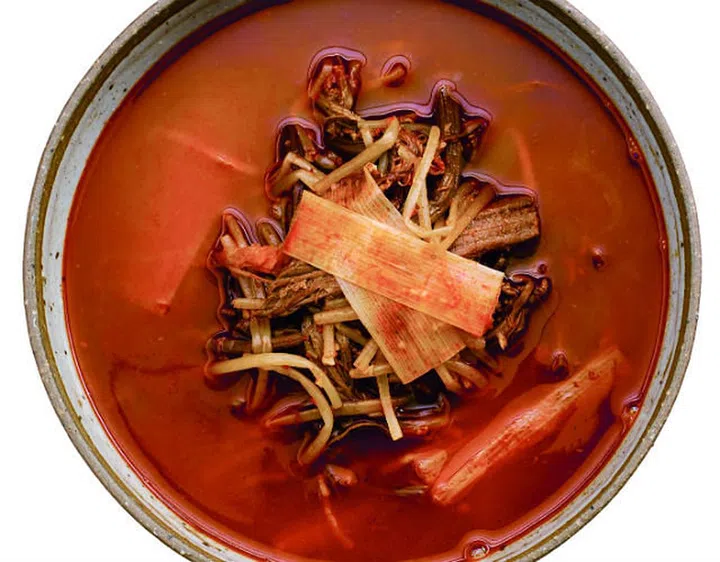 A soup made of beef brisket and innards, radish, leek, taro stems, and fiddleheads. Seasoned with red chili pepper for a spicy flavor.