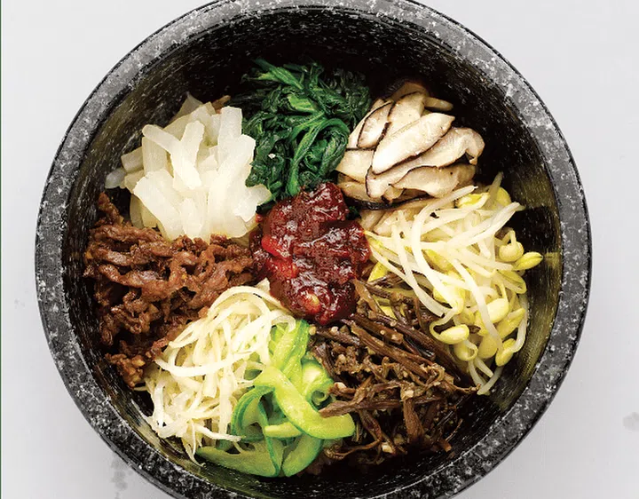 Bibimbap served in a sizzling hot stone pot. The crispy rice at the bottom, mixed with various toppings and gochu-jang sauce, remains piping hot until the end of the meal.