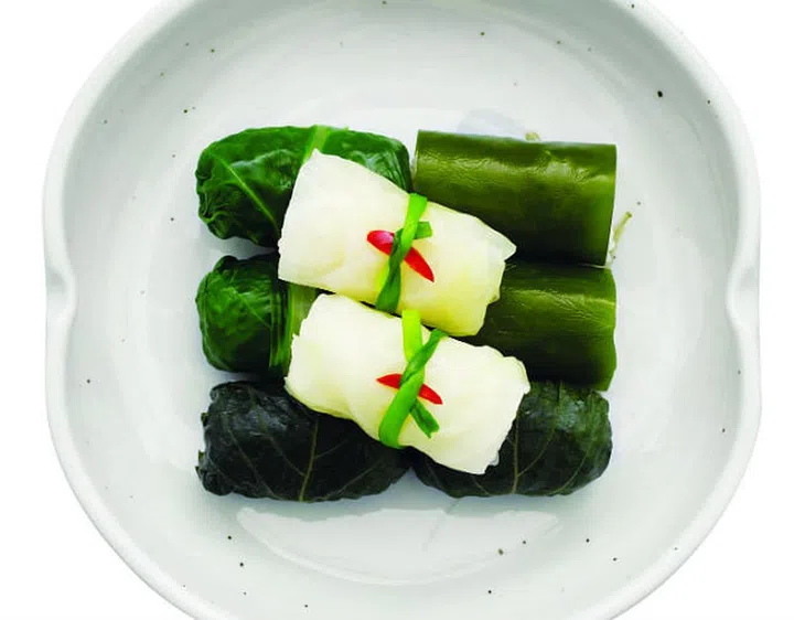 Steamed rice wrapped in leafy vegetables or seaweed with seasoned sauce. Lettuce, perilla leaves, napa cabbage, squash leaves, cabbage, dried laver, brown seaweed, and kelp may be served as wraps.
