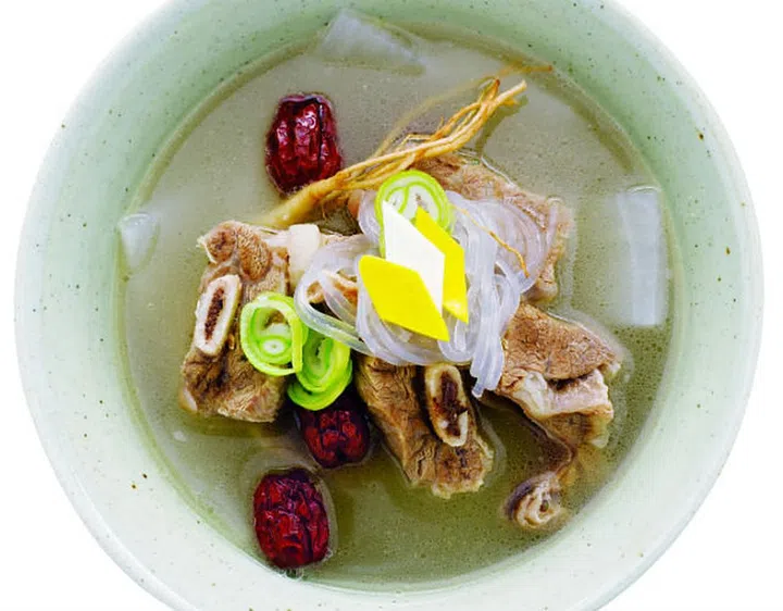 Beef ribs, soaked in cold water to remove the blood, and white radish chunks simmered together until tender. The clear stock is rich and savory, and the tender meat falls off the bone easily. (glass noodles may be added.)