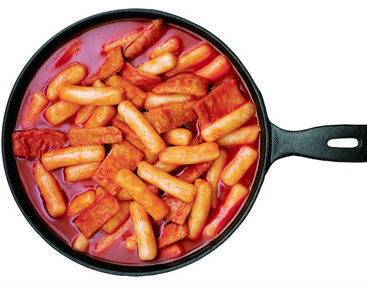 Sliced rice cake bar (garae tteok) or thin rice cake sticks (tteok-bokki tteok) stir-fried in a spicy gochu- jang sauce with vegetables and fish cakes.