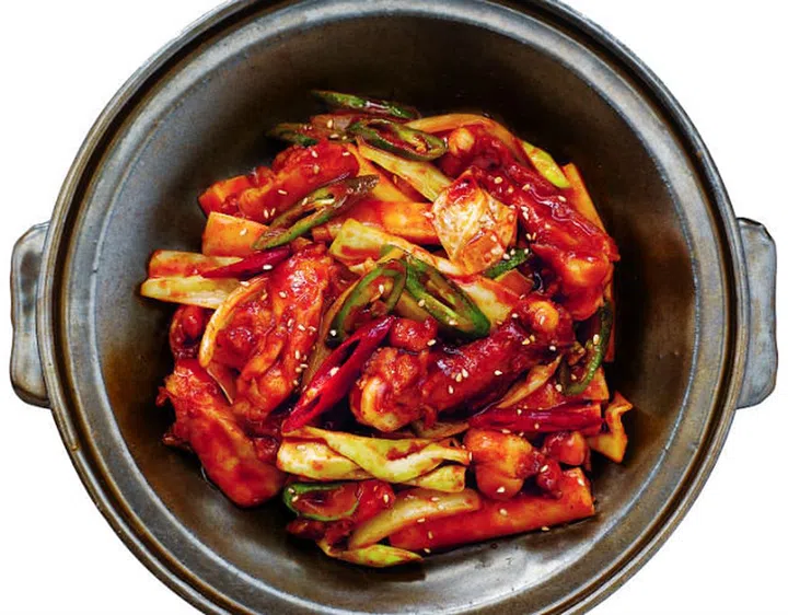 Chicken pieces marinated in a gochu-jang sauce, and stir-fried in a flat grill pan with cabbage, sweet potato, carrots, or tteok (rice cakes). A local dish of Chuncheon city in Gangwon Province.