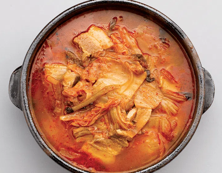A spicy stew made with sour kimchi, after removing the kimchi condiments, along with fatty pork, shellfish, and chunks of tofu and green onion. Served hot with steamed rice.