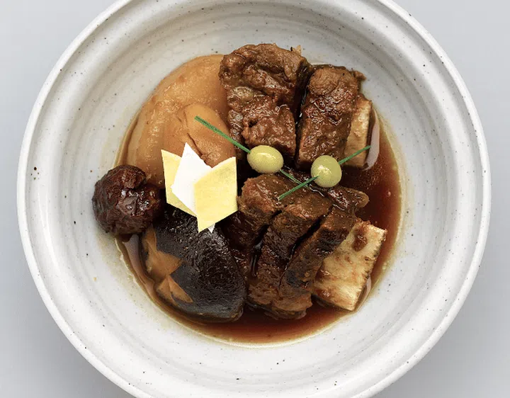 Beef or pork short ribs, soaked in cold water to remove the blood, trimmed of fat, seasoned in sweet soy sauce, and braised until tender with carrots, chestnuts, ginko nuts, and other vegetables.
