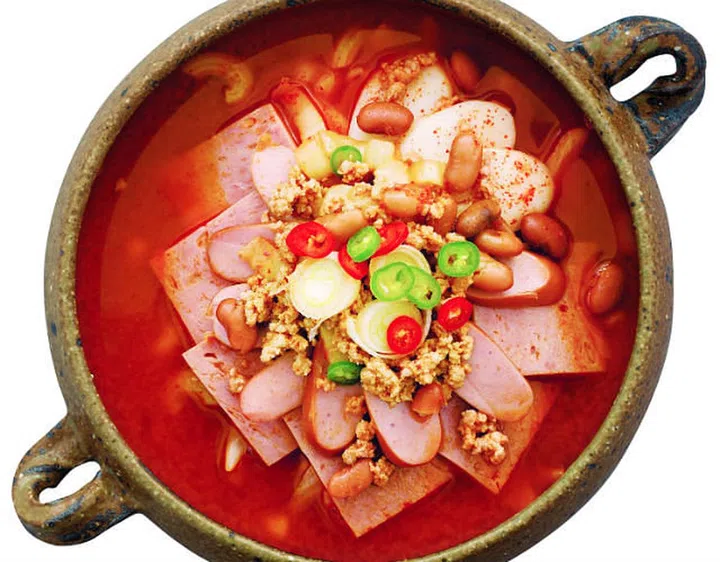A fusion dish made with ham, sausage, kimchi, pork, and tofu. Everything is combined and cooked in a spicy broth. Oftentimes, ramyeon noodles are added to the simmering stew.