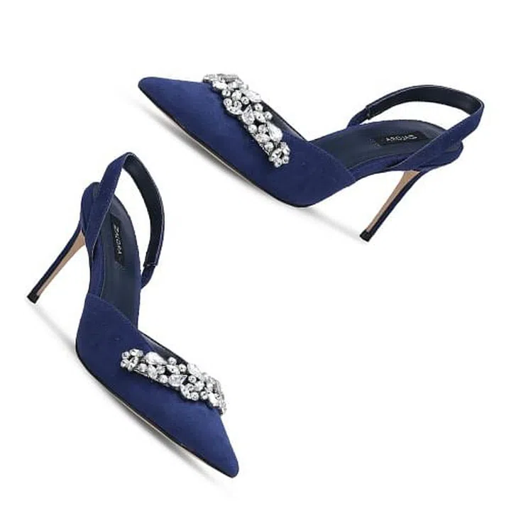 Pointy slingbacks are slowly making their way back in again, and we love the addition of sparkly gems as they help to lift these blue babies.