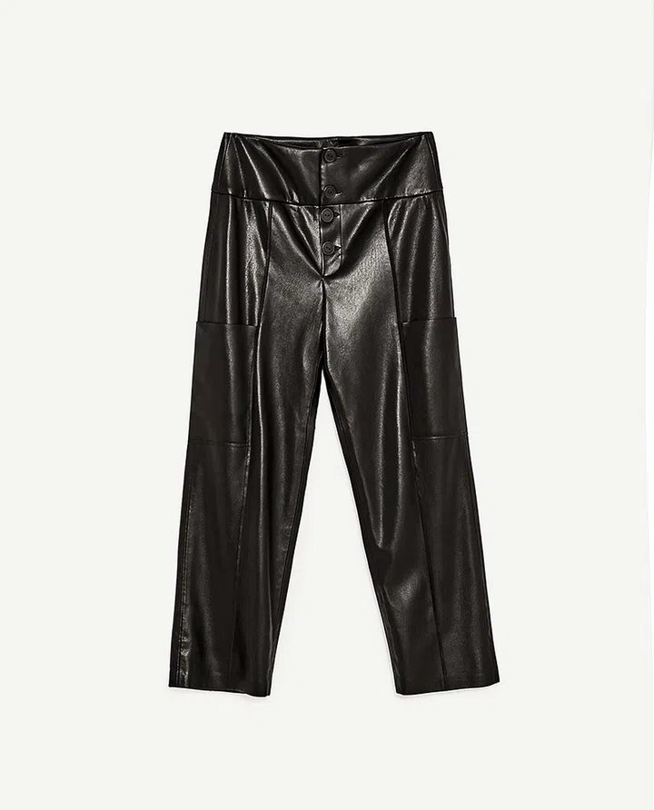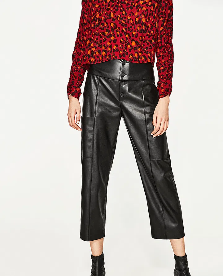 We advocate sticking to just two colours: black and burgundy, as these are the easiest to match and are tame enough for a regular day on the street. While they might not be entirely appropriate for the strictest of offices (and it would be wise to double-check before trying one for casual Friday), they can easily be dressed up with a neutral coloured top and a lightweight blazer. Oh, and the must-have shoe to pair with leather pants? Red high-heeled, pumps, of course. Image: Zara vinyl palazzo trousers, $59.90