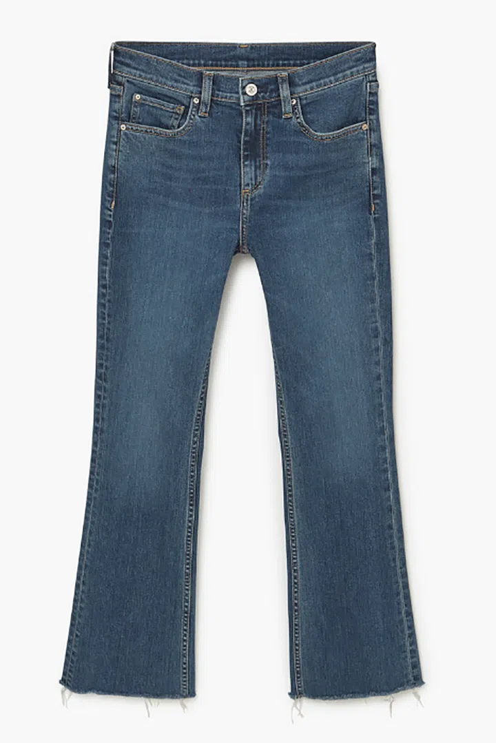 We recommend that the hem of your jeans be cropped at least 5cm above your ankles to really accentuate the flare. One vital thing to keep in mind is that flared pants can make your legs look shorter, so balance out your figure by tucking in your top and wearing high-heeled ankle boots or pointy pumps. Image: Mango flared trousers, $89.90