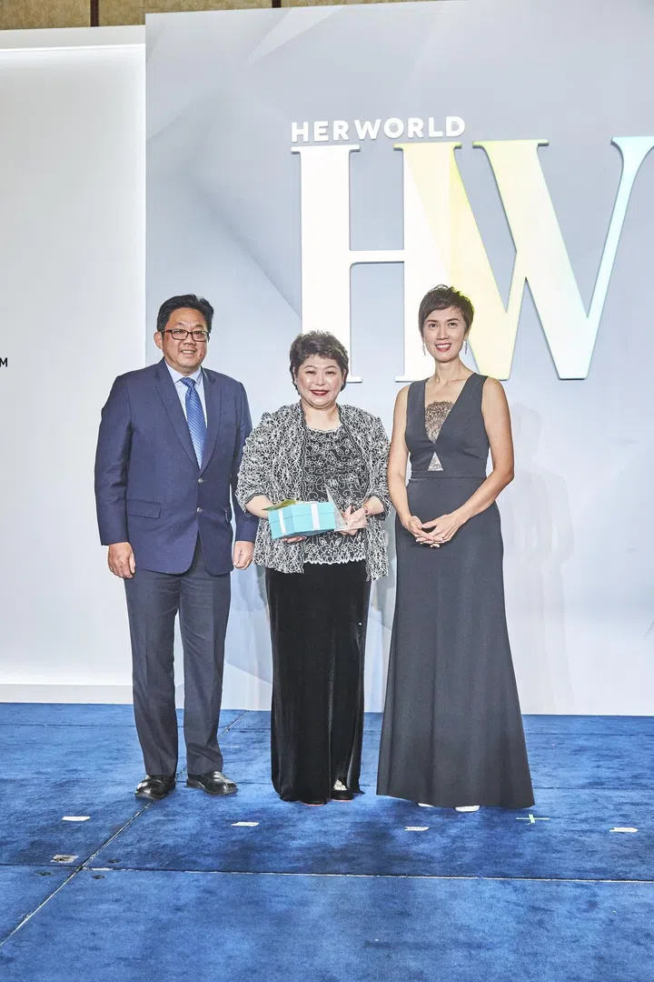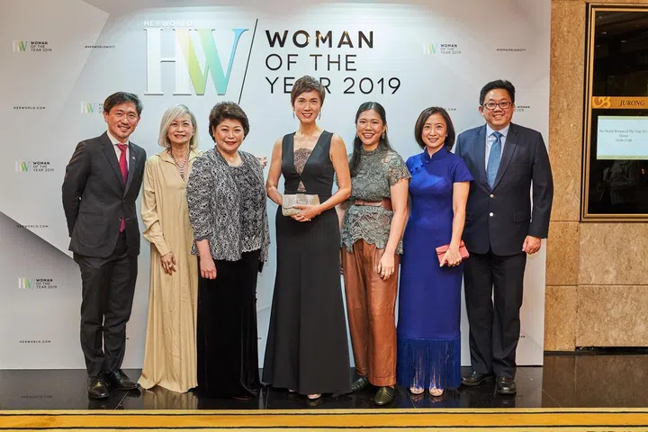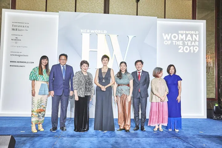 From left: SPH Deputy CEO Anthony Tan, SPH Magazines Group Editor-in-Chief Caroline Ngui, 2019 Woman of the Year Susan Chong, Minister of Manpower Josephine Teo, 2019 Young Woman Achiever Annabelle Kwok, SPH Magazines CEO Maureen Wee and SPH CEO Ng Yat Chung.