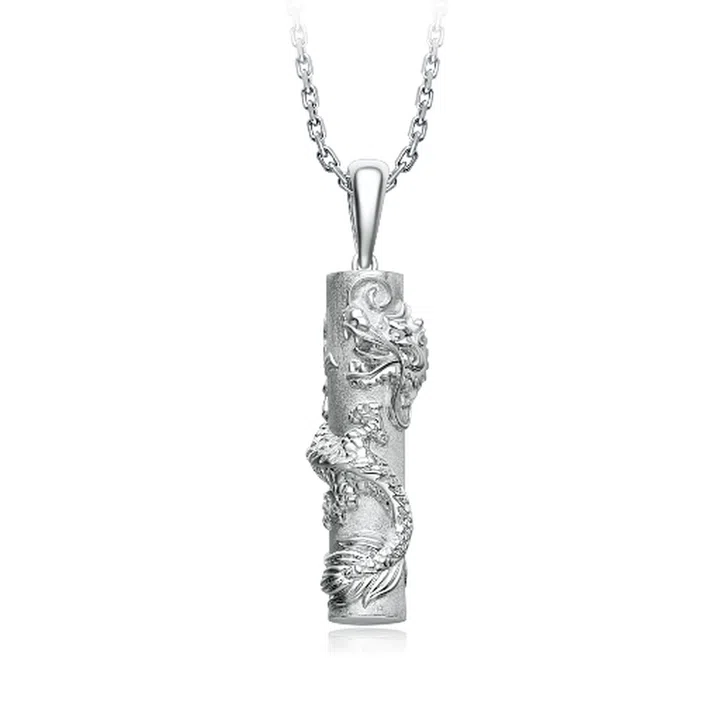 This necklace features a 3D dragon design carved on the surface, entwining the cylindrical shaped pendant. The dragon is a significant symbol in Chinese culture, and it can be likened to a father figure metaphorically, highlighting the powerful and brave attributes that the head of the family possesses.