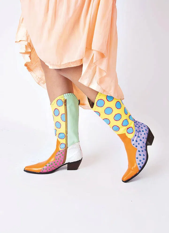 If you ever need a fashion pick-me-up on a blah day, Zig Zag Goods is the name to know. Based in sunny Los Angeles, this quirky label is a shared obsession between two besties Amanda Adam and Piper Cashman. Highlights include cowboy boots with polka dots, oversized floral trousers, exaggerated fringed tank tops, and many more rule-breaking outfits.