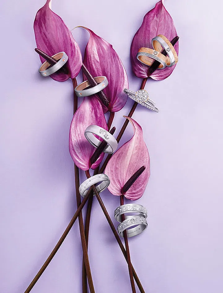Clockwise from bottom: Love Zodiac white gold bands, and Romanzo white and rose gold bands with heart motifs, from SK Jewellery. Brilliant Rose Eternal Love white and rose gold diamond bands with floral engraving, Brilliant Rose Duet of white and rose gold diamond solitaire ring and white gold diamond eternity band, and Brilliant Rose Eternal Love white gold bands with engraving, from Soo Kee Jewellery.
