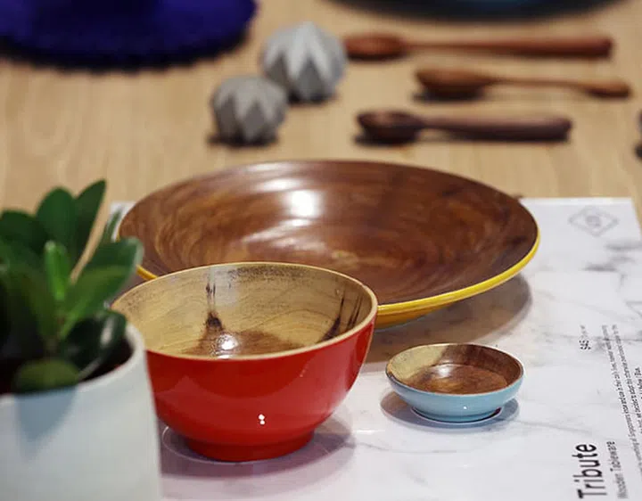 For example, a tribute tableware set –a saucer, bowl and plate – sells for US$35 and comes in red, yellow or blue. The wooden crockery set with a lacquer finish is inspired by hawker-style tableware and was an idea from local multi-disciplinary design house Acre.