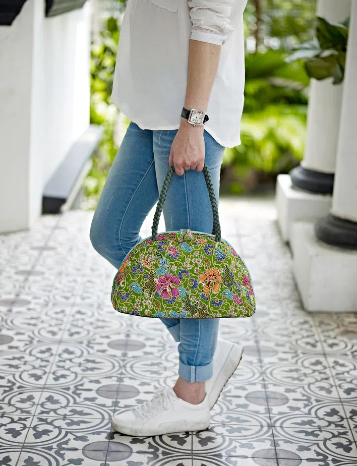 The bags and purses are made of batik-print cloth embroidered with beads. They are designed and produced in Indonesia.