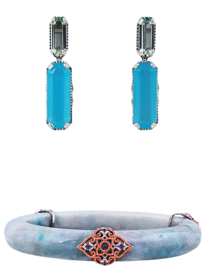 Shophouse Gemstone Earrings in white rhodium, light blue chalcedony and green amethyst, $328; Peranakan Flower Trio Bangle in rose gold, white rhodium, rhodolite garnet and pink amethyst, from $3,000