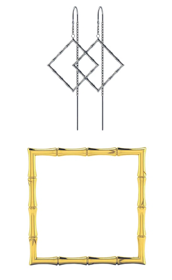 Bamboo earrings in 925 sterling silver with palladium, rodium-plated, US$155 (S$220); square bamboo 18K gold-plated bangle in 925 sterling silver with palladium, US$235