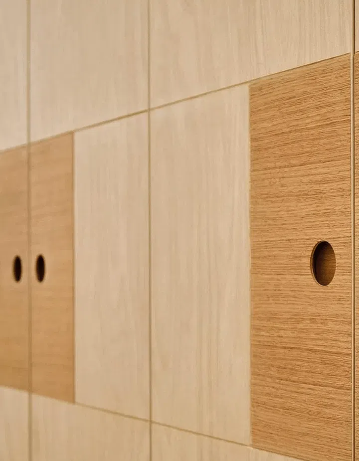 This perception is conveyed through a series of spatial layers. Crossing the threshold and looking straight ahead, a low shoe cabinet defines the entrance foyer while introducing the first of many layers.