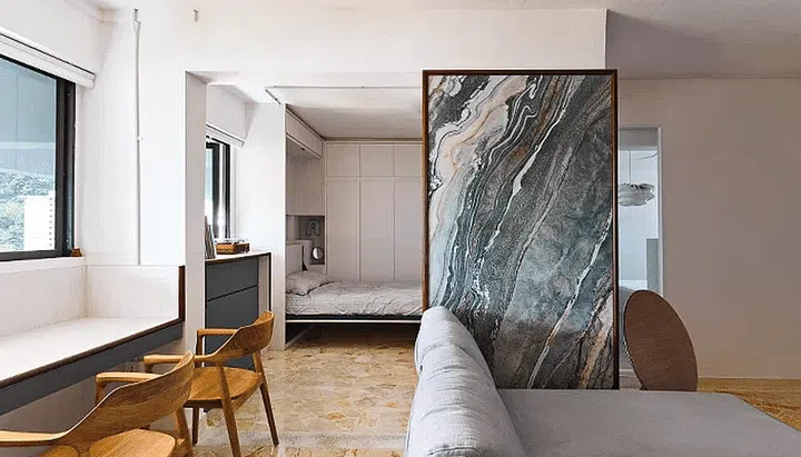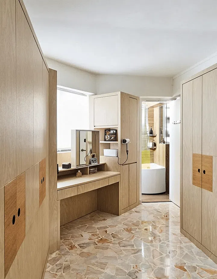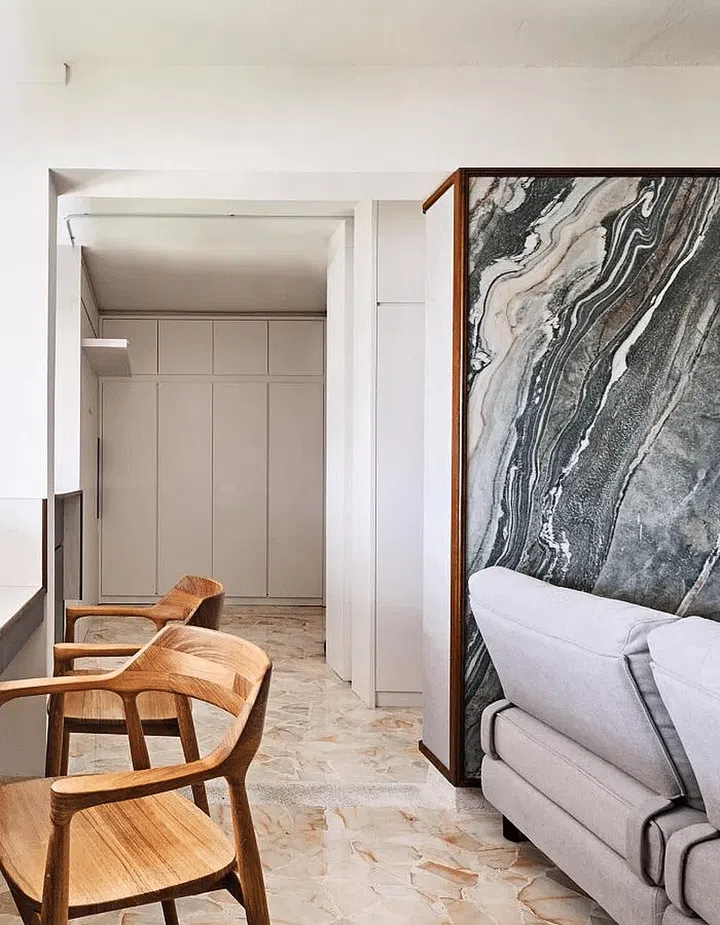 They had some specific requirements in their brief. Apart from retaining the existing pink marble flooring, they wanted an open plan that would maximise natural lighting and cross-ventilation within the long and narrow flat.