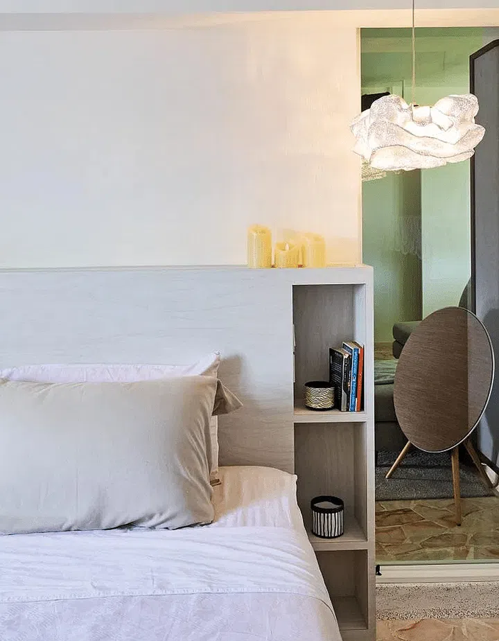 The wall to one of the bedrooms was demolished to create an open, multi-purpose room that can be closed off using a curtain. This forms a third layer.
