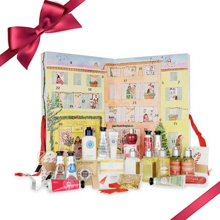 Unbox the tabs day by day for 24 skincare and body-loving favourites! This gives you: Aromachologie Relaxing Shower Gel 35ml, Repairing Shampoo 35ml, Shea Body Lotion 30ml, Shea Ultra Rich Cream 10ml, Almond Delicious Hands 10ml, Pivoine Flora Hand Cream 10ml, Shea Shower Cream 30ml, Cherry Blossom Shimmering Lotion 35ml, Verbena Shower Gel 30ml, Roses & Reines Hand Cream 10ml, Almond Shower Oil 35ml, The Vert & Bigarade Shower Gel 30ml, Verbena Fresh Towelette, Jasmin & Bergamote Shower Gel 30ml, Cherry Blossom Shower Gel 35ml, Shea Butter Hand Cream 10ml, Verbena Leaf Soap 25g, Cherry Blossom Mini Eau de Toilette 7.5ml, Verbena Hand Cream 10ml, Immortelle Essential Water 30ml, Shea Cleansing Water 30ml, Almond Delicious Soap 50g, Almond Milk Concentrate 20ml, and Shea Foot Cream 10ml.