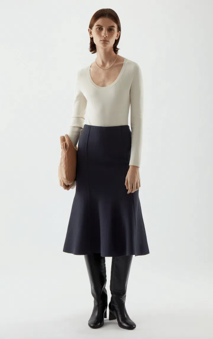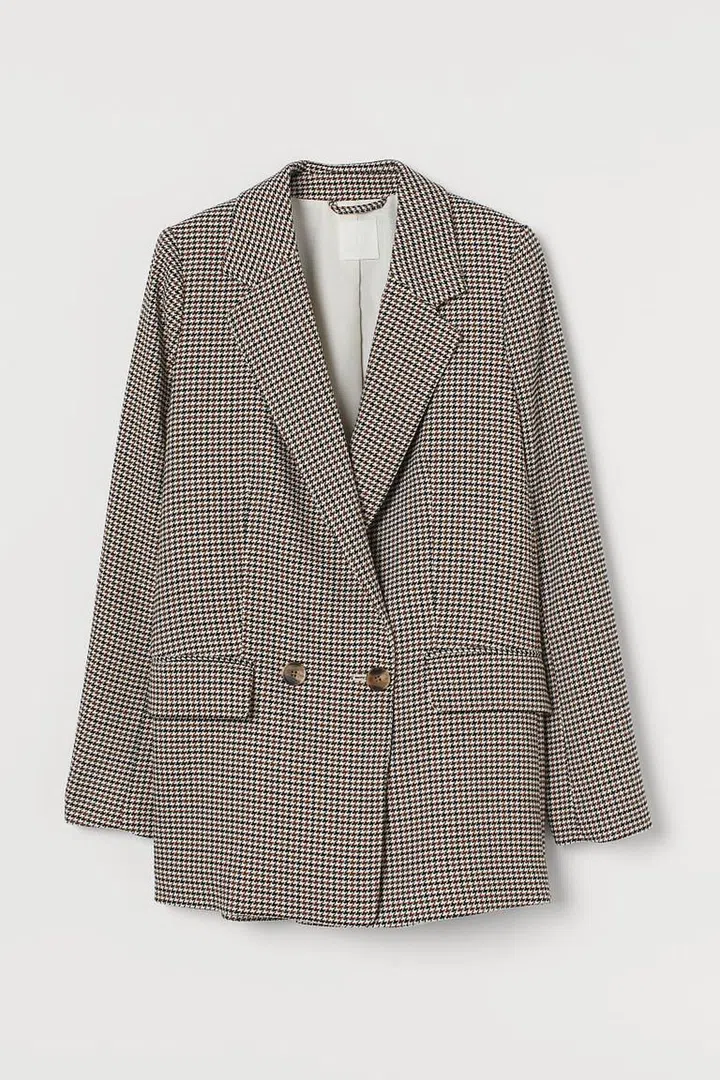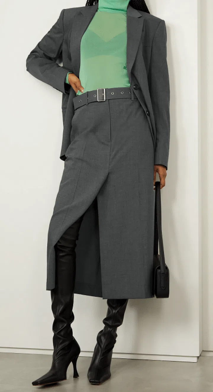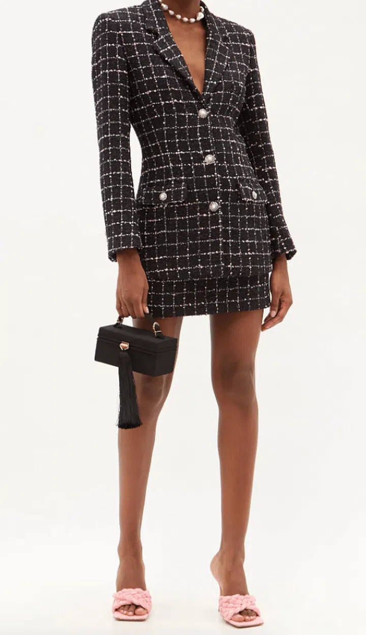The next thing to consider when choosing a suit that fits you is your body shape. For rectangular body shape, you'll want to reach for a cinched in blazer and high waist skirt to create the illusion of a more defined silhouette.