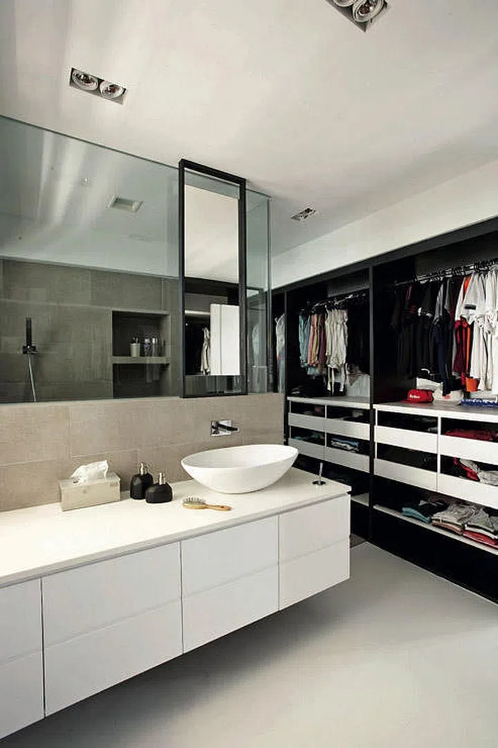 The master bathroom and adjoining walk-in wardrobe are kept similarly minimalist with crisp, clean, customised cabinets and sleek fixtures. The neutral, minimalist scheme cost the homeowners $60,000.