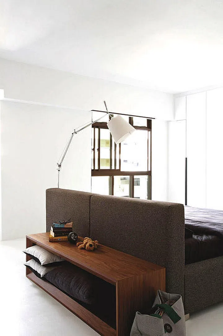 All three-bedrooms were hacked away to create a large expanse of space. At the foot of the bed are floor-to-ceiling slim-doored, flushed cupboards that offer lots of storage. Walnut table cum storage unit, from The Lifeshop.