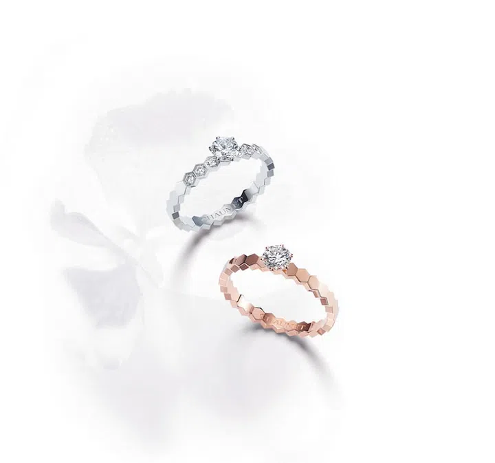 • The Bee My Love stackable solitaire and wedding bands with diamonds and a distinct honeycomb design.