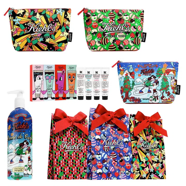 Kiehl’s collab with artist and product designer Jeremyville showcases adorable illustrations of ice skaters, snowmen, and Christmas ornaments as well as shooting stars on gift packs as well as products like its bestselling Creme de Corps, Lip Balm #1 and Ultra Facial Cream.