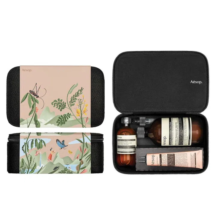 The amenity case with a beautifully illustrated paper sleeve designed by Norwegian artist Bendik Kaltenborn contains full sizes of Aesop’s pampering body products – A Rose By Any Other Name Body Cleanser, Rejuvenate Intensive Body Balm and Resurrection Aromatique Hand Balm as well as Hand Wash.