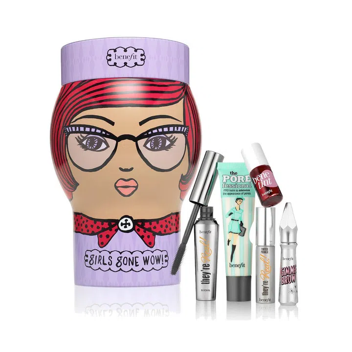 Bring an instant smile to all with this brightly coloured doll's head tin of Benefit’s full-sized They’re Real! Lengthening Mascara and Tinted Primer, the Porefessional, and Gimme Brow Volumizing Eyebrow Gel, as well as mini Benetint Cheek & Lip Stain.