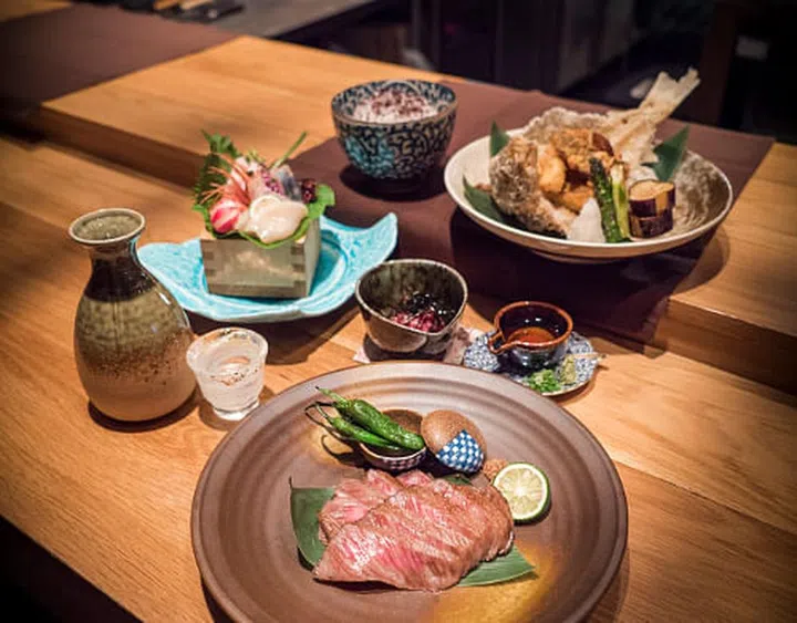 It's backed by two other seafood appetisers: sashimi moriwase, and a deep-fried whole flounder. The pièce de resistance is the beautifully marbled A4 Kobe Wagyu sirloin, charcoal-grilled and finished with smoked salt and kabosu lime.
