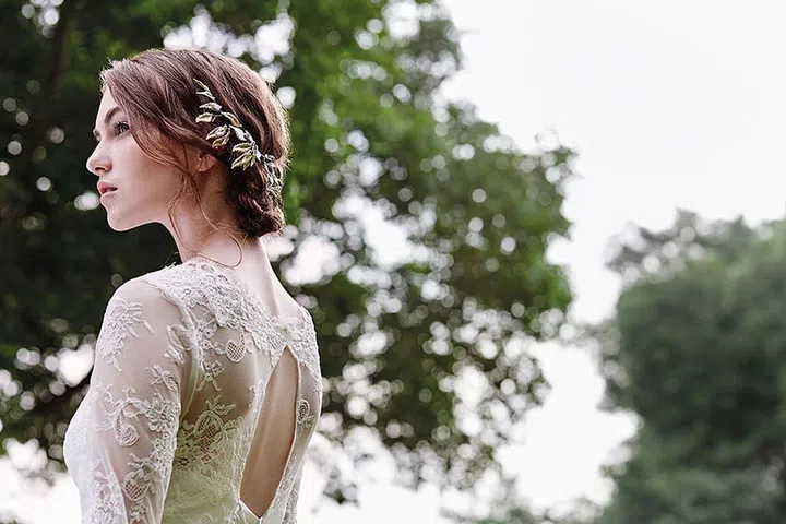 Clay and crystal headpiece from Gioiell, A-line lace dress from Digio Bridal.