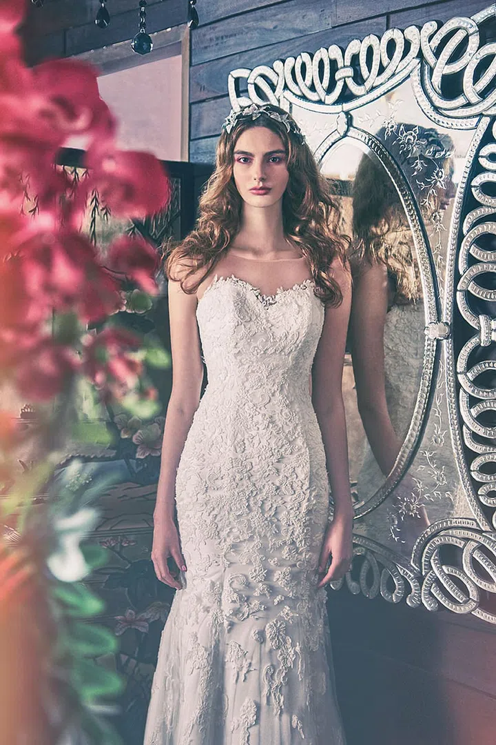 Lace and polyester sain fluted gown with chapel train from Digio Bridal.