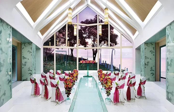 Perched on a cliff, the illuminated glass chapel offers charming views of the resort's lush lawns and the Indian Ocean. One of its highlights include a flowing "river" underneath a glass aisle that leads to a magnificent glass altar. See Nicky Wu and Cecilia Liu's romantic pastel wedding, real couple Wilson and Cameron's reception, as well as Melinda and Andrew's wedding here.