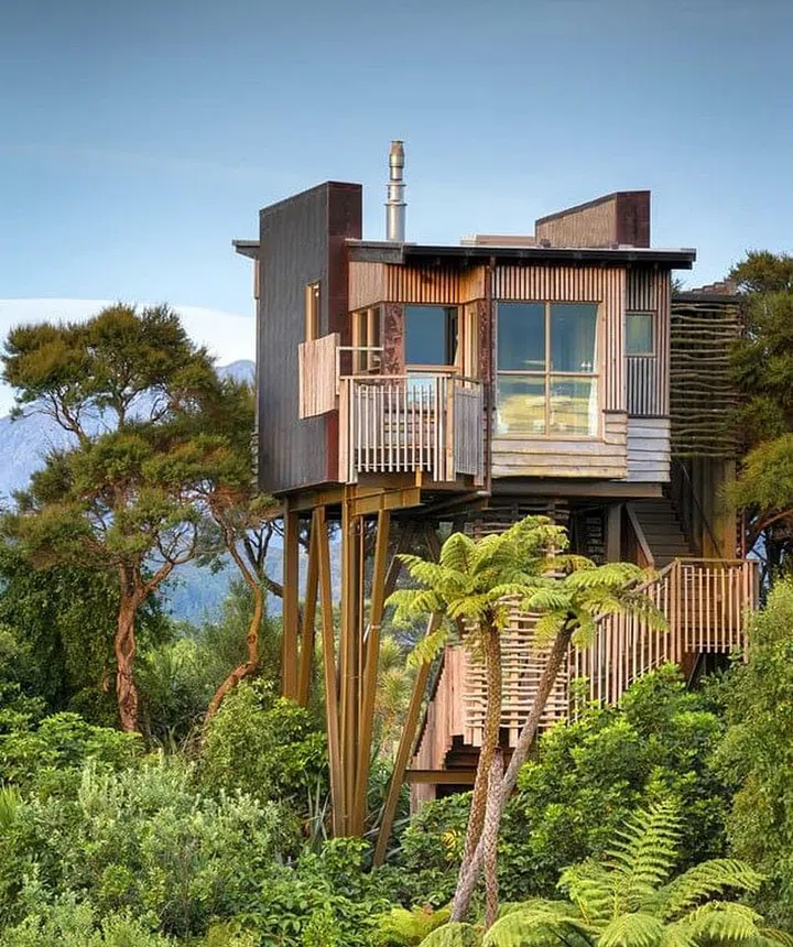 From the outside, though, this is a treehouse perched on stilts 10m above the ground, among the branches of a stand of native trees. Five stylish boxes of wood, glass and copper are the literal high points of Hapuka Lodge at Kaikoura on the South Island.