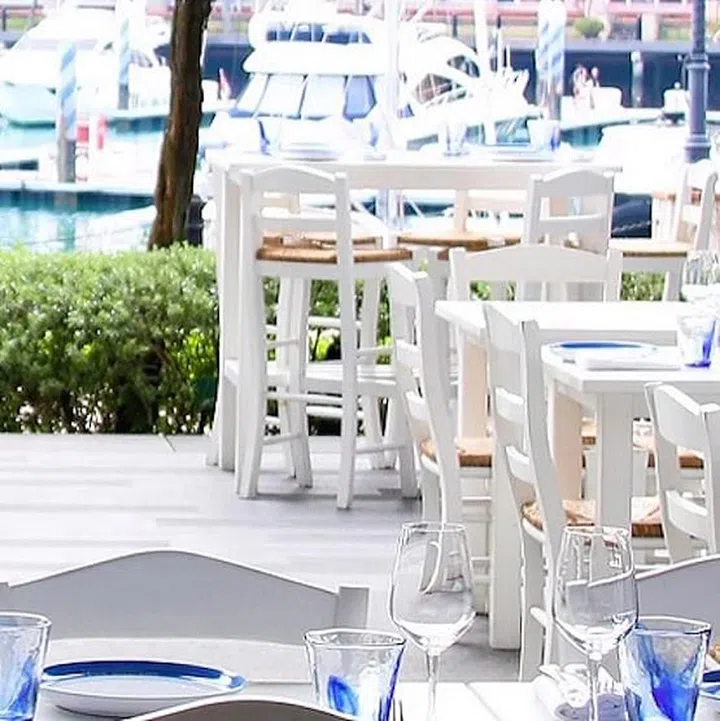 Or, be transported to the seaside of Greece with this Santorini-inspired restaurant decked out in a clean blue-and-white theme.