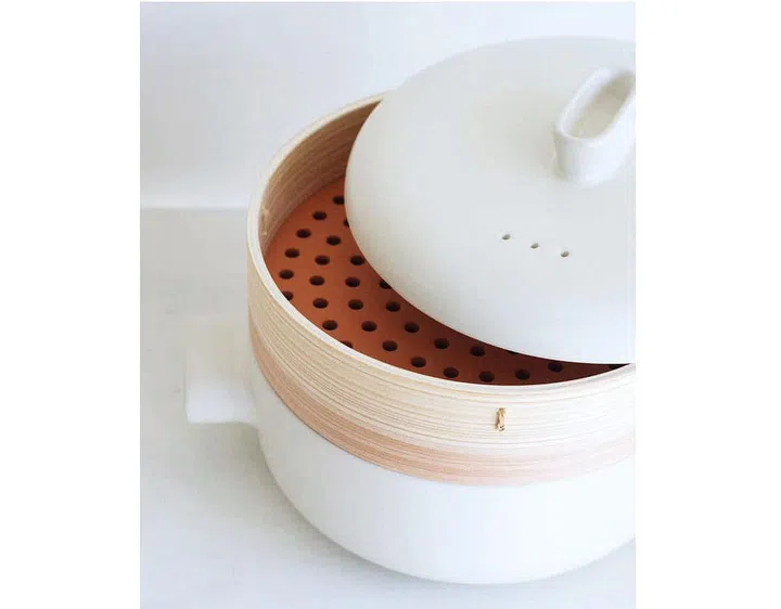 This elegant steamer is just the thing to motivate you to whip up healthy steamed dishes more often. The ceramic bottom tier can be used on the stove and in the oven, and the cedar-rimmed basket is lined with a perforated terracotta base.