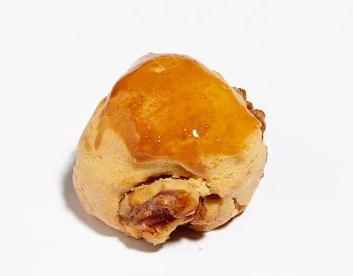 How adorable are these pint-sized walnut moon tarts? This retro number has a buttery shell with a cookie-like snap, and the requisite smooth paste. The fat chunks of walnut are a nice change from the usual melon seeds too.