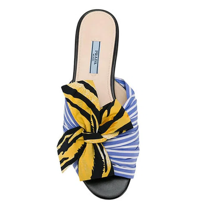 Crafted from blue, white, black and yellow striped cotton, these flat-heeled slip-ons from Prada feature an open back, a branded leather insole and an open-toe for maximum comfort and ease of wear. With its summery colour scheme and bold prints, this pair of sandals establishes itself as an absolute key item to complete your arsenal of footwear for the season.