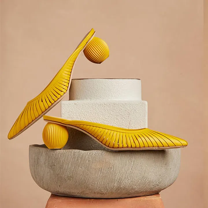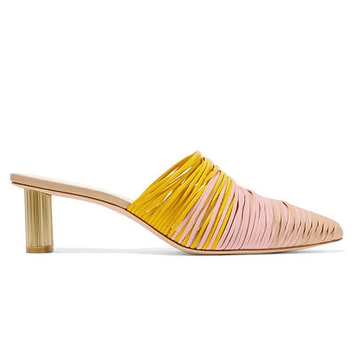 Taking after the famed Ark bag’s woven raffia design, this pair of mules employ strips of smooth beige, yellow and baby-pink leather to create a gorgeous straw-like design with pretty sorbet hues. The grooved gold heel adds a touch of refined elegance to this casual number, allowing you to wear it for both formal occasions and casual weekends.