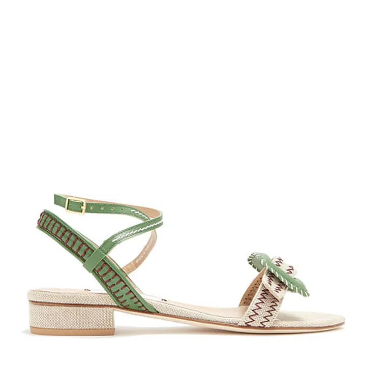 Adding a sense of quirkiness and playfulness to warm-weather dressing, these sandals uses contrast stitching in mahogany-brown and white to create fun patterns and details. They’re crafted with an eye-catching olive-green leather strap and woven canvas front straps to complement the insoles and heels. Sure to add an artisanal kick to your ensemble, these sandals are practically a must-have for the season.