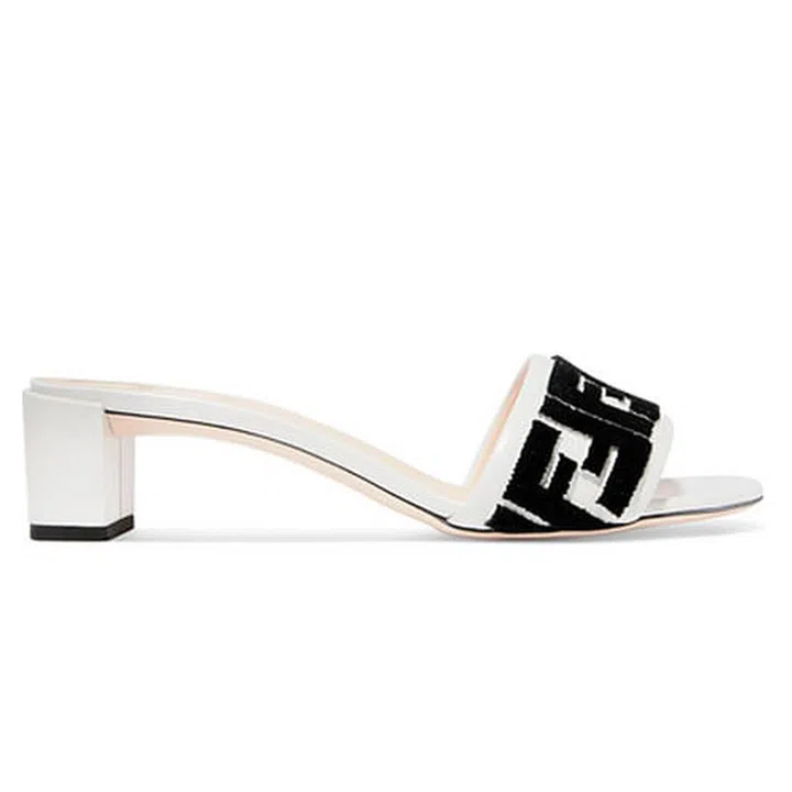 The iconic Fendi Zucca pattern (also known as the double-F monogram) that has become a house signature for Fendi adorns the strap of this pristine and sophisticated pair of mules. Crafted from smooth white leather, these mules feature the Zucca logo in plush black velvet— a subtle touch of luxe that pushes these mules in a contemporary direction.