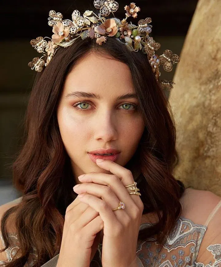Wearing your hair down in loose waves is a modern look to accompany an elaborate and romantic floral tiara.