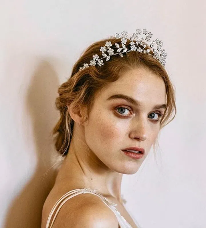 To go with a loose and romantic updo, and fresh-faced makeup - a tiara with sparkling, delicate blooms.