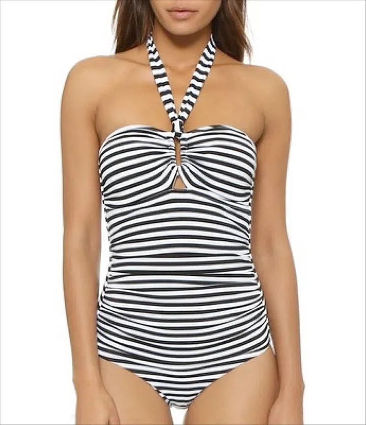 Horizontal stripes work better than vertical ones on a swimsuit, especially when it comes in a ruched design. What tummy? Also, you can't go wrong with a classic black and white swimsuit.