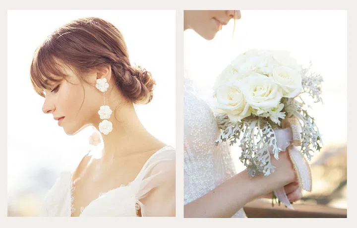 Chiffon and lace gown, price upon enquiry, DIGIO BRIDAL. Fabric earrings, $39, GIOIELLI.