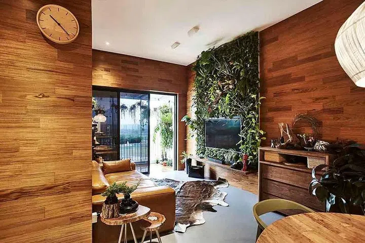 For the weary urbanite, a touch of greenery (and lots of woodsy elements) can introduce a calming and relaxing ambience to your home. Turn your television wall into a statement-maker with this green feature wall!